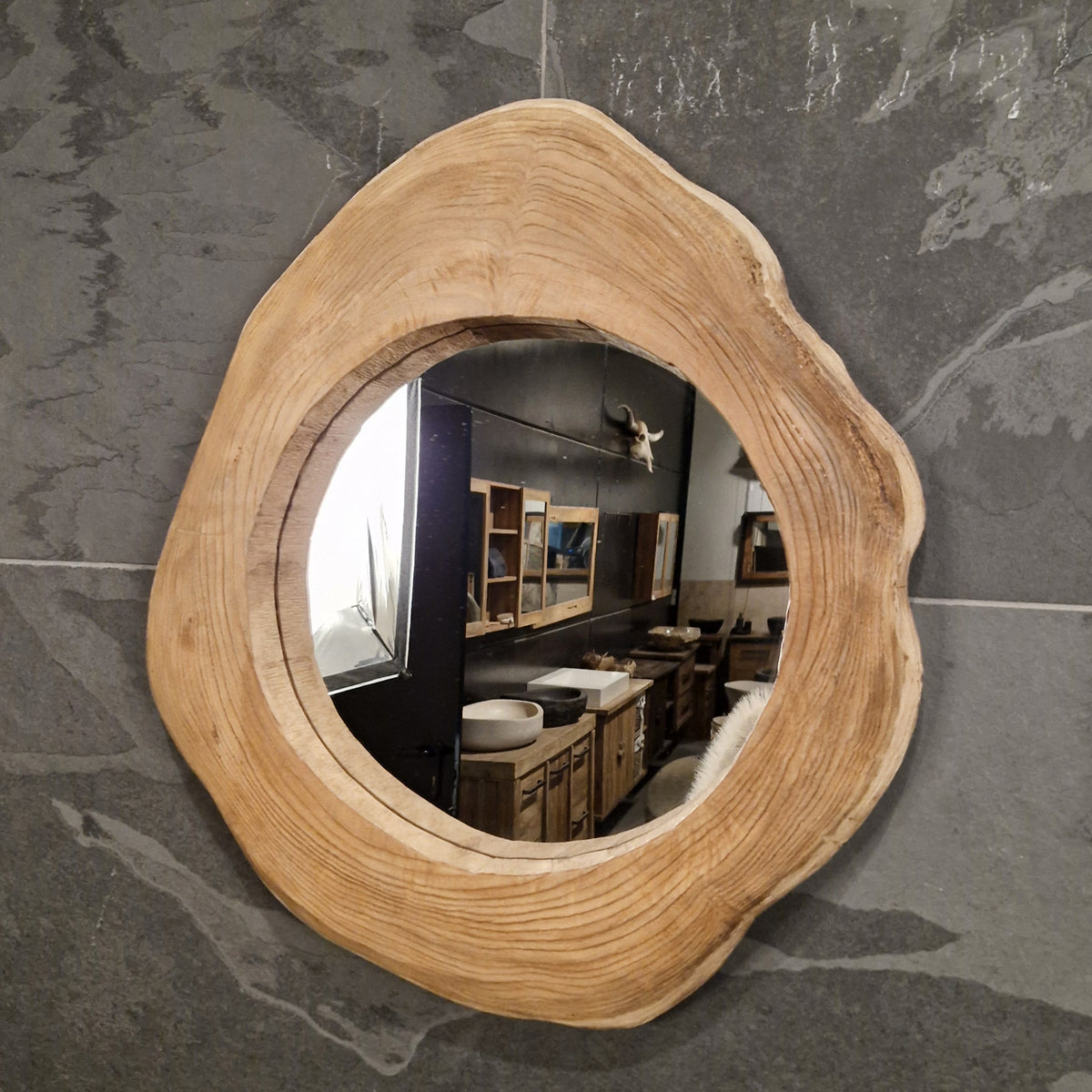 Teak spiegel met spectaculair frame van gerecycled teakhout, boomstamhout, een bijzonder badkamermeubel of de blikvanger in uw hal.